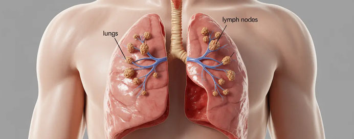 Sarcoidosis is an inflammatory disease in which small clusters of immune cells, called granulomas, form in various organs, most commonly the lungs and lymph nodes. This causes organ inflammation and can affect normal function. The exact cause is unknown but is believed to involve an abnormal immune response to environmental or infectious triggers. Symptoms vary widely, and early diagnosis with imaging, pulmonary function tests, and sometimes biopsy is essential. Treatment focuses on controlling inflammation and managing symptoms to prevent long-term organ damage.